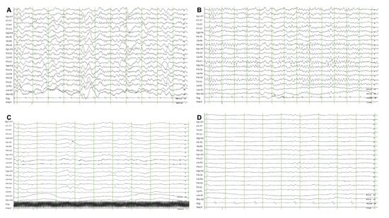Example of predominant background electroencephalography frequency in out-of-hospital cardiac arrest survivors subjected to targeted temperature management. (A) Predominant alpha waves; (B) predominant theta waves; (C) predominant delta waves; (D) undetermined background electroencephalography.