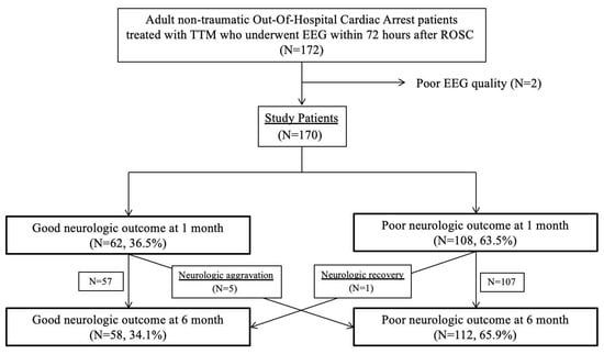 Among 277 non-traumatic comatose OHCA survivors treated with TTM, 170 patients who underwent standard intermittent EEG during TTM were finally included (Figure 2). Between 1 and 6 months, one patient showed neurologic recovery, while five patients showed unfavourable neurologic outcomes or death at 6 months after CA. Finally, 170 patients were categorized into the favourable (n = 58, 34.1%) and poor (n = 112, 65.9%) neurological outcome groups, respectively.