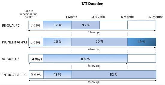 In the AUGUSTUS trial patient population with AF and recent stenting, stent thrombosis was rare (<1% over 6 months), occurred early after PCI, and was numerically less frequent in patients receiving apixaban than VKA [15]. A trend toward an elevated risk of ST was observed in the RE-DUAL PCI trial, in the DAT group randomized to 110 mg of dabigatran with P2Y12 inhibitor [12]. If robust, postulated increased risk of ST with use of NOAC+SAPT in the previous meta-analyses would be of particular clinical importance as the question of an optimal time period to drop aspirin after PCI in AF patients remains unanswered yet [23]. As patients have the highest risk for coronary ischemic events in the first days-weeks after PCI, patients in the recent 4 RCTs were on triple therapies for some intervals from the index event to enrollment (PIONEER AF-PCI ≤ 3 days, RE-DUAL PCI ≤ 5 days, AUGUSTUS ≤ 14 days, and ENTRUST-AF PCI ≤ 5 days; Figure 2) [10,11,12,14]. Despite the 3–14 days of TAT in these trials, Figure 3, some risk of stent thrombosis exists. Therefore, a short time period for a triple therapy (at least one month), might still be recommended if the bleeding risk is low.