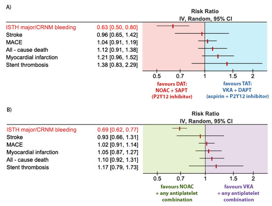 Forest plot for the main outcome parameters according to the treatment groups: (A) Dual antithrombotic therapy (DAT) consisting of non–vitamin K antagonist oral anticoagulants (NOAC) + single antiplatelet therapy (SAPT) vs. triple antithrombotic therapy (TAT) consisting of vitamin K antagonist (VKA) + dual antiplatelet therapy (DAPT); (B) NOAC (+ any antiplatelet combination: SAPT or DAPT) vs. VKA (+ any antiplatelet combination: SAPT or DAPT).