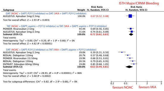 3.3.3. TAT vs. TAT: NOAC + P2Y12 Inhibitor + Aspirin vs. VKA + P2Y12 Inhibitor + Aspirin