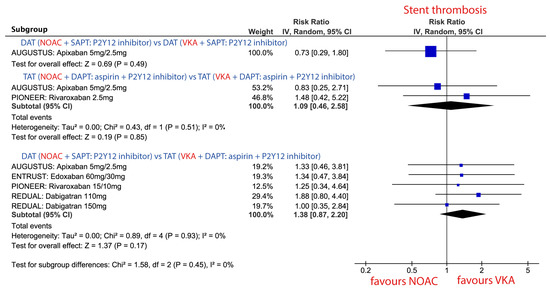 Recently, randomized controlled trials (RCTs) have been conducted to compare the safety and efficacy of NOACs versus VKA as a combination with single or dual antiplatelet agents (SAPT/DAPT) in patients with AF undergoing PCI or presenting with ACS [9,10,11,12,13]. Importantly, the ENTRUST trial has been published recently, completing the data on NOAC use in this indication [14]. Unique data on the risks of ST in each treatment arm from the AUGUSTUS trial were published recently [15]. To summarize the existing evidence, we performed a meta-analysis evaluating the safety and efficacy of NOAC vs. VKA with different antiplatelet combination strategies in patients with AF following elective or urgent PCI. A particular focus of this meta-analysis was to perform subgroup analyses focusing on various combinations of antithrombotic strategies as dual or triple antithrombotic therapies (DAT or TAT) while always comparing NOAC vs. VKA.