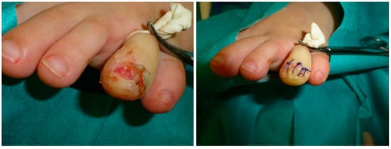 - Starnes, A.; Crosby, K.; Rowe, D.J.; Bordeaux, J.S. Subungual exostosis: A simple surgical technique. Dermatol. Surg. 2012, 38, 258–260. [Google Scholar] [CrossRef] [PubMed]