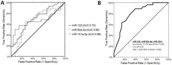 Receiver operating characteristic (ROC) curve analysis for single microRNAs (A) and combinations (B: miR-122-5p, miR-151a, miR-92a-3p) to discriminate PWS from OB subjects. (B) The AUC for the combination of the three miRNA was determined as 0.81 (0.64-0.90, 95% CI) with a sensitivity of 77.7% and a specificity of 71.4%, at a cut-off 0.56 (logit model formula: –1.34 + 2.97 × miR-122-5p - 0.57 × miR-92a_3p + 1.62 × miR-151a-5p). AUC, area under the ROC curve; CI, confidence interval.