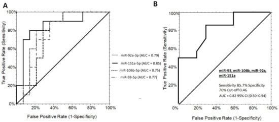 The diagnostic potential of each significant miRNAs in discriminating PWS+ vs. OBS+ grade 1 was further evaluated. Independent ROC curve analysis showed a solid individual performance of each miR-151a, mir-92a-3p, miR-106b-5p, and miR-93-5p with AUC values of 0.85 (0.56–0.95, 95% CI), 0.79 (0.50–0.92, 95% CI), 0.75 (0.46–0.89, 95% CI), and 0.77 (0.49–0.90, 95% CI), respectively (Figure 2A). At the established diagnostic cut-off values, the optimal sensitivity/specificity for miR-151a, miR-92a-3p, miR-106b-5p, and miR-93-5p were 80/85%, 80/78%, 80/71%, and 70/78%, respectively. One-way stepwise logistic regression analysis of the combination between the four significant miRNAs showed an AUC value of 0.82 (95% CI (0.50–0.94)) at the established cut-offs of 0.82, with a sensitivity of 85.7%, and a specificity of 80% (logit model formula: –2.34 + 2.48 × miR-92a-3p + 1.47 × miR-151a-5p + 1.97 × miR-106b-5p - 2.55 × miR-93-5p) (Figure 2B). Interestingly, the combination of the significant miRNAs never reached superior performance in comparison to miR-151a alone on discriminating PWS+ from OBS+ grade 1. When considering grade 2/3 of steatosis in both populations, no significant differences were observed among the miRNAs analyzed (Supplementary Figure S1).