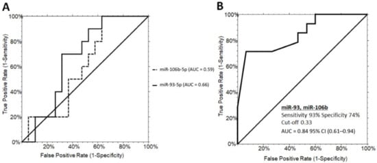 ROC curve analysis of serum miRNAs discriminating PWS+ grade 1 and PWS+ grade 2/3. (A) ROC curves for miR-93-5p (60% sensitivity and 52% specificity) and miR-106b-5p (70% sensitivity and 68% specificity). (B) ROC curves illustrating the performance of the miRNA panel in discriminating grade 1 from grade 2/3 steatosis in PWS+. PWS+, Prader–Willi Syndrome with steatosis AUC, area under the ROC curve; CI, confidence interval.