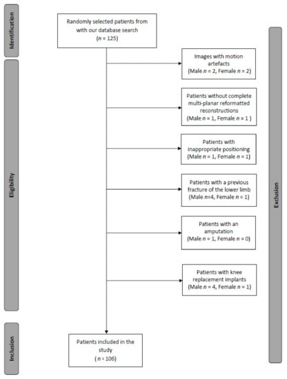 This retrospective study was approved by the institutional review board. The requirement for informed consent was waived. Patients who underwent contrast-enhanced computed tomographic angiography (CTA) encompassing the pelvis and lower extremities were included. CTA data sets of the lower limbs were used since almost all data sets display both lower legs allowing the assessment of the tibial nutrient artery and comparison of right and left sides. Furthermore, these patients most likely have a normal osseous anatomy without fractures impairing the evaluation of the tibial nutrient artery canal. Exclusion criteria were incomplete examination, inadequate image quality, or previous fracture of the lower limb. Figure 1 illustrates the inclusion/exclusion process of our patient population.