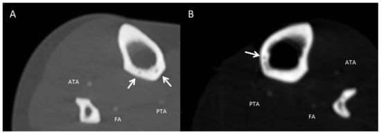 Axial reformatted images in bone window illustrating atypical number and topology of the TNAC. (A) Two canals traversing the posterior aspect of the tibia (two white arrows). (B) TNAC traversing the medial aspect of the tibia (white arrow). ATA: Anterior tibial artery. PTA: Posterior tibial artery. FA: Fibular artery.