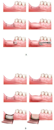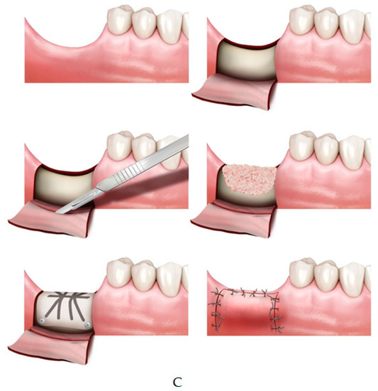 - Xuan, F.; Lee, C.U.; Son, J.S.; Fang, Y.; Jeong, S.M.; Choi, B.H. Vertical ridge augmentation using xenogenous bone blocks: A comparison between the flap and tunneling procedures. J. Oral Maxillofac. Surg. 2014, 72, 1660–1670. [Google Scholar] [CrossRef]