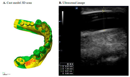 Outcome measures were collected at visit I (pre-operative), visit IV (tissue expander removal), and at visit VI (6 months after bone graft). Cast models were scanned with a 3D scanner (Trios3®, 3Shape, Denmark) and transferred into a database integrated software (Geomagic Control X, 3D systems, USA) to measure soft tissue dimensional changes (Figure 3A). Scanned 3D images were exported as STL files (standard tessellation language), and each patient’s images at different time points were superimposed using adjacent teeth from the defective site as the reference point and landmark as the best-fit initial alignment [21,22]. Three vertical cross sections and three horizontal cross sections were measured to observe the horizontal and vertical changes. For the vertical change, a cross-section was drawn as a plane crossing the central fossa, then two parallel planes 3 mm right and left of the central plane were drawn at the buccal and lingual sides, respectively. Horizontal dimensional change was measured with points 2, 4, and 6 mm from the cemento-enamel junction of adjacent teeth. The RMS (root mean square) estimate values were recorded for each pair, and their mean changes were calculated.