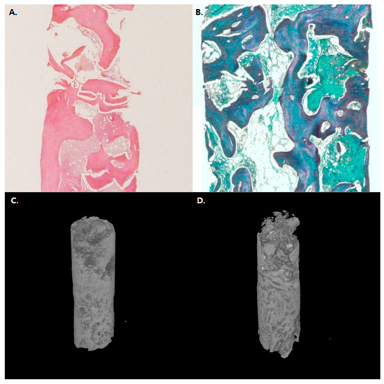 Histologic and microCT evaluation of the bone; representative histologic images of (A) TEG group HE staining and (B) control group MT staining. (C) 3D-reconstructed microCT image of TET group. (D) 3D-reconstructed microCT image of the control group showing favorable osteogenesis and osteoconduction.