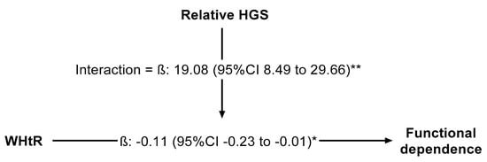 Moderation models. Beta expressed as unstandardized regression coefficients and 95% confidence interval. Because there was substantial covariance between strength capacity and body mass—and, moreover, the links between muscle strength and both physical function and chronic health were mediated by the proportion of strength relative to body mass—grip strength (HGS) was relative as strength per body mass (i.e., (HGS in kilograms)/(body mass in kilograms)). Moderation analysis in which relative handgrip strength moderate the relationship between waist-to-height ratio (WHtR) and functional dependence, adjusted by age, gender, and lifestyle (alcohol intake, smoking, and physical activity “proxy”); * p < 0.01; ** p < 0.001.