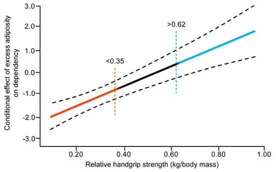 The PROCESS macro in the SPSS statistical software package, version 24.0 (IBM, Chicago, IL, USA) for Windows, was used to conduct a moderation analysis. Preliminary analysis showed no significant interactions between gender and abdominal obesity in relation to functional dependence (p = 0.814); therefore, all analyses were performed with men and women together. Moderation analysis was conducted to examine whether WHtR levels were related to increased dependence and to determine whether this negative effect was moderated by relative HGS. This relationship used ordinary least squares regression analysis when predicting continuous variables (WHtR and relative HGS in the study). A simple slope plot was used to visualize the effect of the moderator. The Johnson–Neyman approach was used to test the point in which the relative HGS value moderated the relationship between WHtR levels and dependence. The Johnson–Neyman technique determined, along a continuum of moderator values (relative HGS), the region of significance on the relationship between the independent and dependent variables [33]. All tests were adjusted for sex, age, alcohol, smoking status, and physical activity habits.
