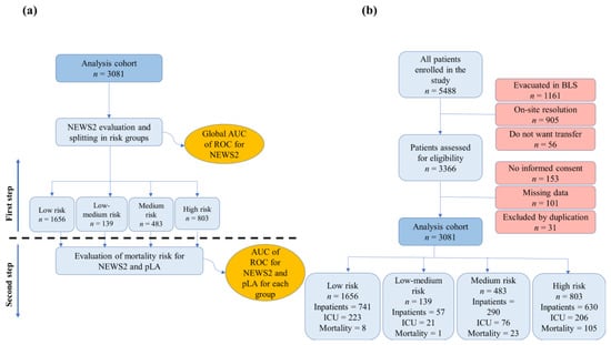 (a) The two-step analysis procedure. (b) Epidemiology diagram showing analysis population by groups derived from the risk stratification provided by the NEWS2. AUC: Area under the curve; BLS: Basic life support; NEWS2: National Early Warning Score 2; pLA: Prehospital lactate; ROC: Receiver operating characteristic.