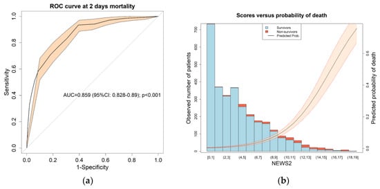 Before splitting the sample in the risk groups, the NEWS2 performance to predict mortality was evaluated presenting an AUC of 0.859 (95% CI: 0.82–0.89; p < 0.001; Figure 2a). The internally validated AUC was 0.859 (95% CI: 0.85–0.86). As can be seen in Figure 2b, the highest NEWS2 values correspond to an increase in mortality within two days, also shown by the predicted probability trend line.