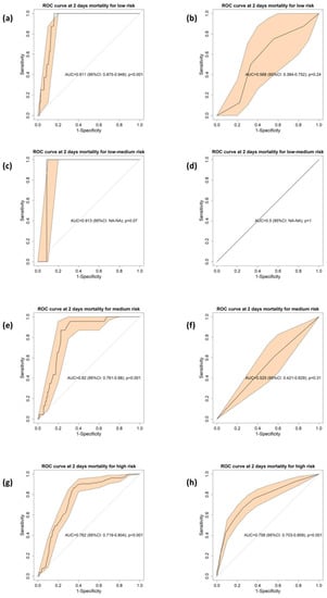 Receiver operational characteristic (ROC) of pLA for early mortality based on the stratification of the risk of mortality. (a) Low risk, (c) low-intermediate risk, (e) intermediate risk, (g) high risk; and ROC of NEWS2 for early mortality based on the stratification of the risk of mortality (b) low risk, (d) low-intermediate risk, (f) intermediate risk, (h) high risk. The bold line shows the value of the ROC curve and the orange shading is the 95% confidence interval. In the center of the graph is the area under the curve (AUC), its 95% confidence interval, and the p-value of the comparison against the null hypothesis (AUC = 0.5).
