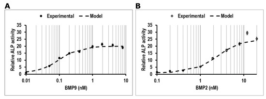 ALP activity measurement relative to control in respect to the number of cells. Dose-response effect of (A) BMP9 (●), (B) BMP2 (○) on ALP activity in hmrSCs incubated for 3 days in culture medium containing 10% (v/v) FBS and their mathematical modeling (-). The results are the mean ± SEM of four independent experiments performed in triplicate.