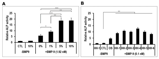 Then, to confirm whether human serum acted on hmrSCs response to BMP9 as did FBS, cells were stimulated with various concentrations of serum from a healthy donor (HH-1) with or without BMP9 at 1.92 nM. BMP9 was used at this concentration since it induced the maximum value of relative ALP activity in the presence of FBS (positive control) at 10% (v/v) (Figure 2A). Without BMP9, the relative ALP activity was similar in the presence (10% v/v) or in the absence (CTL) of HH-1 serum. In the presence of serum, a dose response was observed from 0% to 5% (v/v), where it reached a plateau. Since there were no significant difference between 5% and 10% (v/v), a concentration of 5% (v/v) of human serum was kept for the rest of the study. The maximum value of relative ALP activity measured was quite similar to what was observed with FBS.