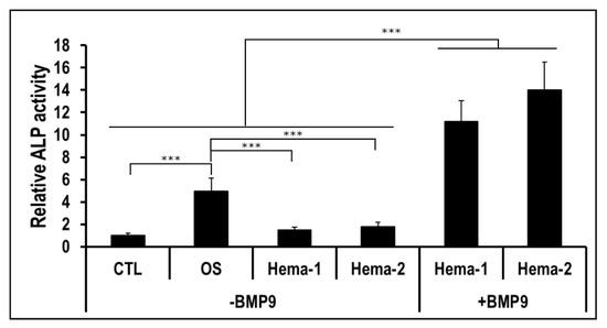 ALP activity relative to the control in respect to the cell number. hmrSCs were stimulated for 3 days with serum from hematoma of 2 patients (Hema-1 and Hema-2) with or without 0.1 nM BMP9. Osteogenic culture medium (OS) was used as a positive control. The results are the mean ± SEM of two independent experiments performed in triplicate. ***p < 0.001.