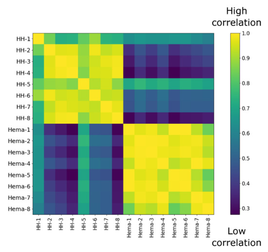 Correlation matrix of ELISA multiplex data from 8 healthy donor serum (HH-#) versus 8 hematoma extracts from pelvic fractures (Hema-#).