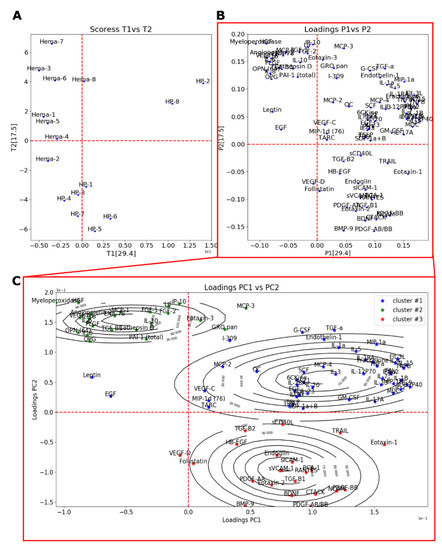 In order to investigate this inter-group difference and since many cytokines were studied simultaneously, a PCA was performed on the centered-reduced data (Figure 5A,B). The first principal component (PC1) could explain ~29.4% of the variance, whereas PC2 explained ~17.5%. The variation on PC1 appeared to be caused by serum sample of two healthy patients (HH-2 and HH-8), while the variation on PC2 was mostly explained by the difference between hematoma (Hema-#) and HH (HH-#) samples. Looking at the loading plots (PC1 vs. PC2), distinctive groups having a great impact on the PC2 could be observed. To affine our research, we performed a clustering analysis using the Expectation-Maximization Clustering Algorithm. In this study, each parameter was assigned statistically to a distinctive group (Figure 5C). Cluster #2 and cluster #3 regroup cytokines that contribute the most to the variance observed between serum from healthy patients (HH-#) versus hematoma (Hema-#). Cytokines belonging to cluster #2 had a positive effect on Hema samples, meaning that there was an increase in their values, whereas cytokines belonging to cluster #3 had a decrease in their values. Remaining cytokines belonging to cluster #1 only had a small contribution to the difference observed between our two patient groups (Hema and HH).