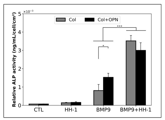 ALP activity relative to the cell number. hmrSCs were cultured on a collagen coating (Col) or a collagen and osteopontin (Col (0.1 mg/mL) + OPN (5 µg/mL)) coating and stimulated for 3 days with 0.1 nM BMP9 with or without HH serum (HH-1). The results are the mean ± SEM of 2 independent experiments performed in triplicate. * p < 0.05, *** p < 0.001.