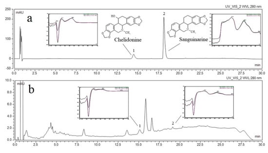 The identification and the determination of active compounds (chelidonine and sanguinarine) contained in the plant material and Chelidonii herba lyophilized extract, as well as all concentration changes of chelidonine and sanguinarine during dissolution and permeability studies, was carried out using an ultra-high performance liquid chromatography supported by a photodiode array detector. The UHPLC-DAD method was developed according to the method described by Gu et al., which was modified in regards to the gradient elution and then validated according to ICH Q2 guidelines []. Validation parameters are presented in Supplementary materials (Table S1). Chelidonine and sanguinarine were dissolved in two different solvents: methanol (as extraction solvent) and a phosphate buffer with pH ~4.5 (as dissolution medium). The retention times of the peaks of chelidonine and sanguinarine were compared with the retention times of the reference substances (Figure 1) as well as their UV spectra. A linear relationship between the peak areas and the concentrations of chelidonine and sanguinarine dissolved in both media was obtained. The range of linearity for both alkaloids was the same, and the sensitivity of determinations was similar. The developed method may be the reference method for determining the concentration of both alkaloids in plant material and pharmaceutical dosage forms containing those alkaloids.