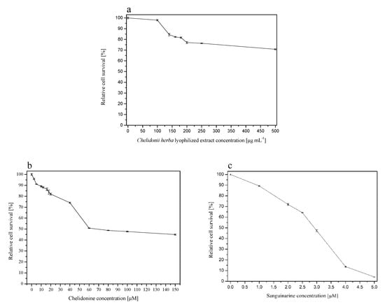 Cytotoxicity of Chelidonii herba lyophilized extract, chelidonine, and sanguinarine in non-tumorigenic MCF10A human breast epithelial cell line was assessed using the MTT test. The stock solutions of all compounds were prepared in DMSO for Chelidonii herba extract at a concentration of 100 mg/mL, for chelidonine at a concentration of 30 mg/mL, and for sanguinarine at a concentration of 3 mg/mL. The assay was performed as previously described []. Briefly, cells were exposed to Chelidonii herba lyophilized extract, chelidonine, or sanguinarine in the range of concentrations 0 to 500 µg/mL, 0 to 150 µM (0 to 53.46 µg/mL), and 0 to 5 µM (0 to 1.84 µg/mL), respectively. Briefly, a total of 5 × 103 MCF10A cells were seeded into each well of 96-well plates in a total medium volume of 100 μL per well. Cells were exposed to the studied compounds for 24 h. The solvent, DMSO in concentration 0.20%, was also applied as a control. Subsequently, 10 μL of MTT solution (5 mg/mL) was added to each well. The cells were incubated at 37 °C for 4 h followed by 100 μL of solubilization buffer (10% SDS in 0.01 M HCl) addition. After a 16 h incubation period, cell viability was quantified using a LabsystemsMultiscan RC spectrophotometer. Three separate experiments were performed, with eight repeats for each concentration. IC50 values were calculated using CalcuSyn (Biosoft, Cambridge, UK), and the standard deviation was calculated using Excel software (Microsoft, Redmond, WA, USA).