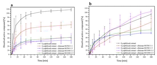 To examine the influence of chitosan on release profiles of chelidonine and sanguinarine from the Chelidonii herba lyophilized extract, dissolution studies were conducted. The dissolution studies in phosphate buffer at pH 4.5 simulating vaginal fluids were determined (Figure 3a,b). In the case of chelidonine release, after 90 min, 103.54% ± 4.10% of chelidonine was released from the lyophilized extract, while only 67.35% ± 11.28%, 32.04% ± 2.11%, 34.28% ± 4.31%, and 37.44% ± 4.73% for lyophilized extract-chitosan 80/500 1:1 (w/w), lyophilized extract-chitosan 80/500 1:5 (w/w), lyophilized extract-chitosan 80/1000 1:1 (w/w), and lyophilized extract-chitosan 80/1000 1:5 (w/w), respectively. Based on the obtained release profiles, it can be stated that over the entire duration of the test (180 min), 95.81% ± 9.70% sanguinarine was released from the lyophilized extract, while from chitosan systems, 77.24% ± 14.23%, 51.25% ± 1.60%, 102.60% ± 5.16%, and 58.92% ± 3.22%, from the following systems: lyophilized extract-chitosan 80/500 1:1 (w/w), lyophilized extract-chitosan 80/500 1:5 (w/w), lyophilized extract-chitosan 80/1000 1:1 (w/w), and lyophilized extract-chitosan 80/1000 1:1 (w/w), respectively.