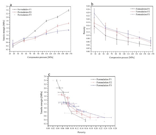 Tabletability (a), compressibility (b), and compactibility (c) profiles of the formulations F1–F3.