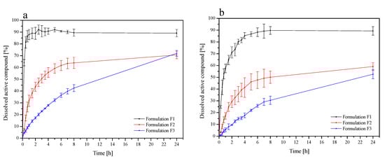 Dissolution profiles of chelidonine (a) and sanguinarine (b) from the chitosan tablets with Chelidonii herba lyophilized extract (F1–F3) at pH ~4.5.