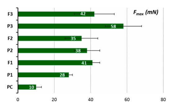 The maximum force of detachment (Fmax, mN) of placebo (P1–P3) and chitosan tablets with Chelidonii herba lyophilized extract (F1–F3) compared to cellulose acetate paper control (PC) (n = 4; mean ± SD).