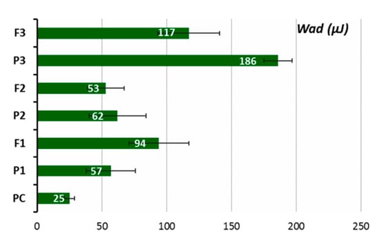 Mucoadhesion (Wad) placebo (P1–P3) and chitosan tablets with Chelidonii herba lyophilized extract (F1–F3) with porcine vaginal mucosa compared to cellulose acetate paper control (PC) (n = 4; mean ± SD).