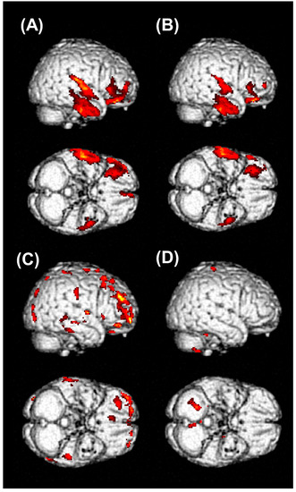 The result of individual analysis of brain FDG-PET/CT. The area colored red in the figure showed decreased FDG uptake in PET images of patients compared to the those of age- and gender-matched healthy control group. (A) The results of an initial brain FDG-PET in a 67-year-old man showed decreased glucose metabolism in an inferior area of the right frontal cortex and right temporal cortices. (B) On follow-up brain FDG-PET images 6 months after intoxication, decreased glucose metabolism in the right frontal and temporal cortices was persistently observed. (C) The results of an initial brain FDG-PET in a 57-year-old man showed decreased glucose metabolism in the right frontal cortex. (D) On 2 months follow-up brain FDG PET images, decreased glucose metabolism in the right frontal cortex was almost recovered. (A,B) Compared to the age of approximately 60 years and male normal healthy subjects (n = 16). (C,D) Compared to the age of approximately 50 years and male normal healthy subjects (n = 16).