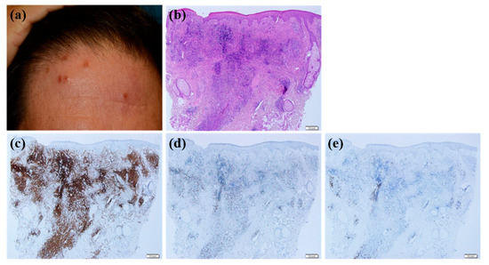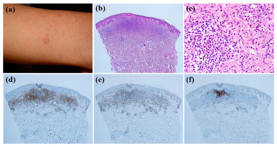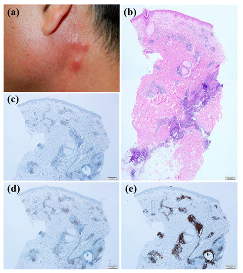 Patients whose skin lesions were related to hair dye tended to be older compared with those with other causative factors (mean age, 67.2) (p = 0.029). All patients with CLH related to hair dye use had multiple lesions (Figure 2a,b) except for 1 patient (p = 0.038). Six of 7 patients with CLH related to hair dye had lesions located on the face (Figure 2a,b) (p = 0.219), and the same number of patients had nodular or follicular infiltration (Figure 2c–f) (p = 0.180). CLH associated with insect bite history tended to be solitary (p = 0.028) and papular (Figure 3a) (p = 0.059). Five of 9 lesions were in the extremities (Figure 3a) (p = 0.124). Histopathologically, infiltration depth was located more superficially than that of other causes (Figure 3b–f) (p = 0.046). In other words, two-thirds of lesions caused by insect bites had dense lymphocytic infiltration on the upper dermis. Moreover, they showed intense eosinophilic infiltration, defined by a semiquantitative parameter of more than 2 (Figure 3c) (p = 0.027). However, in case of spider bites, infiltrations can also involve deeper dermis in contrast to other insect bites. When trauma is related to the formation of CLH, patients were relatively younger than those with CLH caused by other agents (mean age, 42.7; p = 0.060), and 78.6% of these patients had dense B cell infiltration at the site of the lesion (Figure 4a–e). Drug-related CLH lesions were all located on the head and neck area (Figure 5a) (p = 0.033). Four of 5 patients with drug-related lesions had intensive pandermal infiltration predominantly featuring CD4-positive T cells (Figure 5b–e).