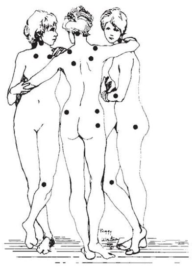 Location of the 18 tender points established as criteria for FMS diagnosis by the American College of Rheumatology (ACR) [1]. Image based on the original “The Three Graces” by the French painter Jean-Baptiste Regnault (1793).