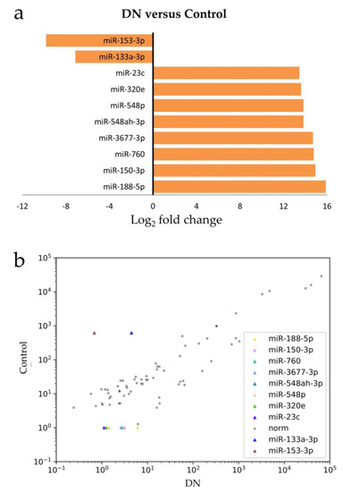 The most deregulated miRs in DN: (a) the differentially-expressed miRs in DN (versus control) are shown in Log2 fold change, with a positive value referring to up-regulation and a negative value meaning down-regulation; (b) the scatter plot shows that these deregulated miRs exhibited correlated-expression pattern between DN and control.