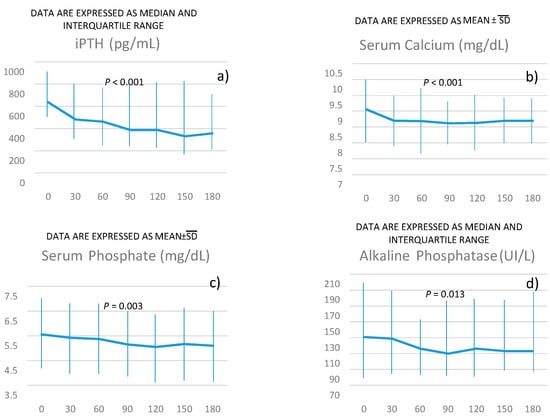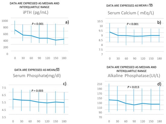 P for the trend of intact parathyroid hormone (iPTH) (panel a), serum calcium (panel b), serum phosphate (panel c), alkaline phosphatase (panel d) over time was obtained using linear regression models weighted for patients’ identification (see methods for more details).