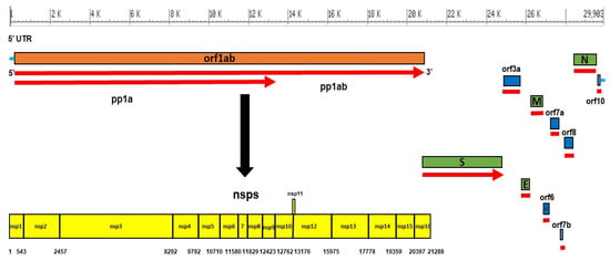 The first ORF (ORF1/ab) constitutes about two-thirds of the virus genome, encoding 16 non-structural proteins (NSPS), while the remaining third of the genome encodes 4 structural proteins and at least 6 accessory proteins. The structural proteins are spike glycoprotein (S), matrix protein (M), envelope protein (E), and nucleocapsid protein (N), while the accessory proteins are orf3a, orf6, orf7a, orf7b, orf8, and orf10, as shown in Figure 1 [,,,].