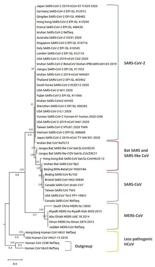 To better understand the evolution of SARS-CoV-2, we performed a phylogenetic analysis of 45 representative coronaviruses from 18 countries including SARS-CoV, SARS-CoV-2, HCoV, bat SARS CoV, bat SARS-like CoV, and MERS-CoV. The viral genomes were obtained from the GISAID and NCBI databases. Multiple sequence alignment was performed using kalign 3 []. A phylogenetic tree was constructed based on whole-genome sequences (coding sequences of all genes) in IQ-TREE, using the maximum likelihood method, ultrafast bootstrap approximation, and ModelFinder [,]. The tree was drawn to scale, with branch lengths measured in the number of substitutions per site. The bootstrap values were determined by 1,000 replicates. The tree was visualized in MEGA X [] (Figure 2).