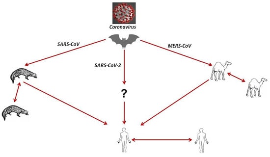 Both established (SARS-CoV, MERS-CoV) and novel (SARS-CoV-2) coronaviruses were reported to spread from an infected person to a non-infected person through direct or indirect contact. SARS-CoV-2 infection was reported to be transmitted directly from person to person like most respiratory viruses via close contact with an infected person or through respiratory droplets (aerosol) produced when an infected person coughs or sneezes. These droplets can be inhaled to reach the lung. The virus can be indirectly transmitted via touching a surface or an object that was previously contaminated with the virus and then touching the face, eyes, or mouth [] and possibly via the fecal–oral route [,]. Asymptomatic carriers (during the incubation period of the virus) and patients after recovery from the acute form of the disease are also considered a potential source of virus transmission to healthy persons [,]. Interestingly, human coronaviruses are able to survive on steel, metal, wood, aluminum, paper, glass, plastic, ceramic, disposable gowns, and surgical gloves for 2–9 days. High temperature (≥30 °C) can reduce the persistence period, while low temperature (4 °C) increases the persistence time up to 28 days []. Transmission of the virus vertically from mother to fetus or via breast milk has not been confirmed yet []. The transmission cycle of coronavirus among animals and humans is shown in Figure 3.