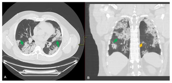 Lung of a 51-year-old male patient with a history of hepatitis C and symptoms of dry cough and shortness of breathing for three weeks. No recent travel or known contacts with infected subjects. Axial (A) and coronal computed tomography (CT) (B) of chest without contrast revealed bilateral peribronchial and subpleural consolidative opacities noted throughout both lungs (green arrow). There were scattered nodular consolidative opacities in a peribronchial distribution (orange arrow). The patient tested positive for SARS-CoV-2 RNA.