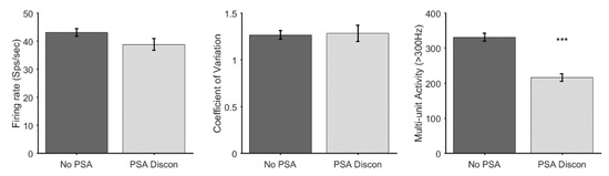 Bar plot and t-test for within awake group analysis for firing rate, defined in spikes per seconds, coefficient of variation and multi-unit activity, defined as activity above 300HZ. Mean and standard error are shown in each bar. *** p < 0.001. PSA: procedural sedation and analgesia.