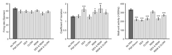 3.3. Effect of PSA Agents on Firing Rate, Coefficient of Variation and Multi-Unit Activity