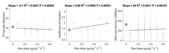 Our analysis showed that DEX had a significant impact on electrophysiological measures. To test whether these effects were dose-dependent, we conducted further analysis focused only on patients who received DEX during surgery. We first performed a simple correlation analysis between each measure and DEX dose (Figure 4). The correlations were significant, but the correlation coefficient was low for all measures. For illustration, we extrapolated the regression line to include 0 dose and plotted the data for the 0 dose patients (not included PSA discontinued group). For both firing rate and CV the regression line passed close to the mean of the 0 dose data, while this was not the case for MUA. This may indicate a non-linear effect of DEX on MUA whereby even a small dose leads to strong suppression. This interpretation would be in line with our finding that discontinuation of DEX, 20 min before recordings MUA also had a large impact. One interesting point is that the analysis of firing rate was significant, showing a decrease in firing rate with increased dose. This might mean that the trend observed in the t-test and linear regression analysis is a true effect.