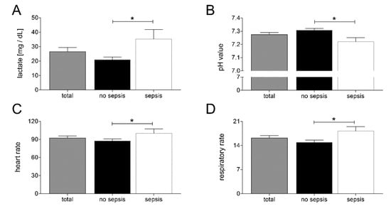 Upon admission of severely injured trauma patients (n = 48) to the emergency department, lactate levels (A), pH values (B), heart rate (C), and respiratory rate (D) were measured. Patients were stratified to those who developed sepsis in their clinical course (sepsis, n = 14) vs. those who did not develop infectious complications (no sepsis, n = 34). Data are shown as mean ± SEM. * p < 0.05 sepsis vs. no sepsis.