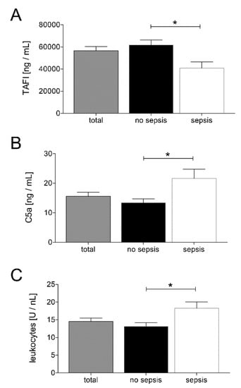 In order to investigate changes in coagulation and inflammation, we measured TAFI and C5a levels at admission to the ED. Patients belonging to the sepsis group had significantly lower TAFI levels and significantly higher C5a levels compared to the no sepsis group, as shown in Figure 2A,B, respectively (p < 0.05). Moreover, patients from the sepsis group showed significantly increased leukocytes counts compared with the no sepsis group (p < 0.05; Figure 2C).