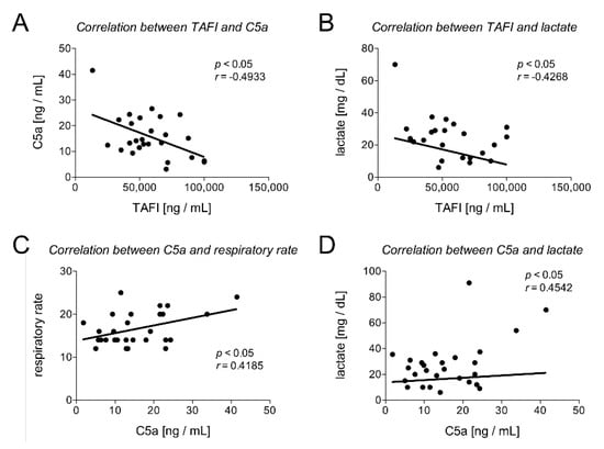In addition, we analyzed correlations between TAFI and/or C5a and clinical (heart and respiratory rate) or laboratory parameters (pH value, leukocyte count, lactate value, INR, thromboplastin time (TPT), PTT, and PLT) and the SOFA score. TAFI and C5a, as well as TAFI and lactate, have shown a significant negative correlation (TAFI and C5a: Pearson r = −0.4933, p < 0.0104 and TAFI and lactate: Pearson r = −0.4268, p < 0.0423; Table 4 and Figure 3A,B). Furthermore, C5a and lactate, as well as C5a and the respiratory rate, had a significant correlation (C5a and lactate: Pearson r = 0.4542, p < 0.0173 and C5a and respiratory rate: Pearson r = 0.4185, p < 0.0266; Table 4 and Figure 3C,D). In addition, correlation analysis of TAFI and C5a with the SOFA score have shown a significant negative correlation of TAFI with the SOFA score (Pearson r = −0.3865, p = 0.0422) and a significant positive correlation of C5a with the SOFA score (Pearson r = 0.3795, p = 0.0386) (Table 4).