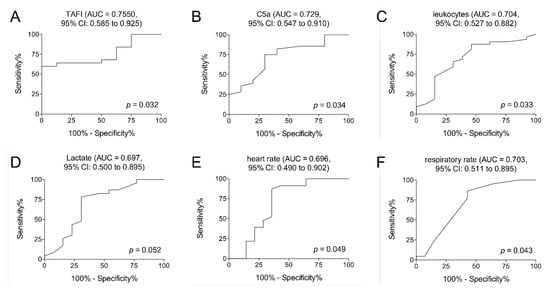 Receiver operating curve analyses on TAFI (A), C5a (B), leukocyte counts (C), lactate levels (D), heart rate (E), and respiratory rate (F) at admission to the emergency department to predict the development of sepsis after polytrauma are demonstrated. p < 0.05: statistically significant, AUC: area under the curve, and CI: confidence interval.