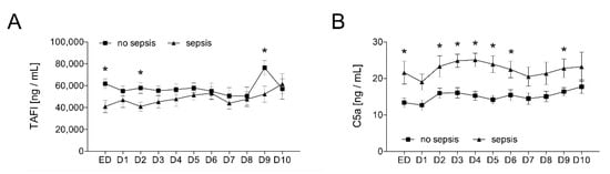 Upon admission of severely injured trauma patients (n = 48) to the emergency department (ED), plasma TAFI levels (A) and plasma C5a levels (B) were determined daily for ten days (D1–D10). Patients were stratified to those who developed sepsis in their clinical course (sepsis, n = 14) vs. those who did not develop infectious complications (no sepsis, n = 34). Data are shown as mean ± SEM. * p < 0.05 sepsis vs. no sepsis at the indicated time.